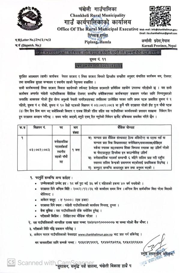 मनोसामाजिक परामर्शकर्ता पाँचौ तहको करार कर्मचारी आवश्यकता सम्बन्धि चौथो पटक प्रकाशित सूचना