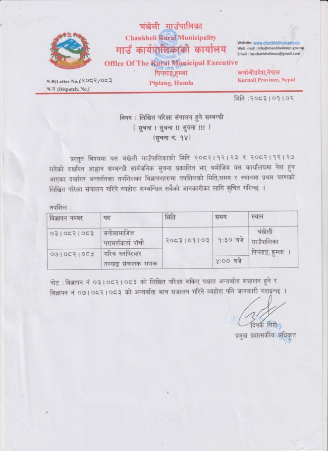 मनोसामाजिक परामर्शकर्ताको लिखित र गरिबी घरपरिवार तथ्याङ्क संकलक गणकको अन्तर्वाता परिक्षा संचालन सम्बन्धि सुचान ।