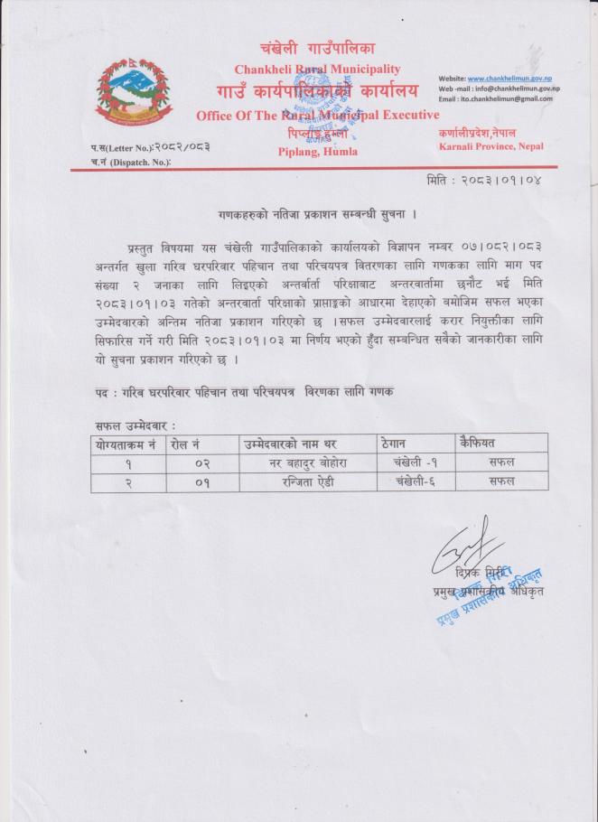 गरिब घरपरिवार पहिचान तथा परिचयपत्र वितरणका लागि आवश्यक गणकहरुको नतिजा प्रकाशित सूचना ।
