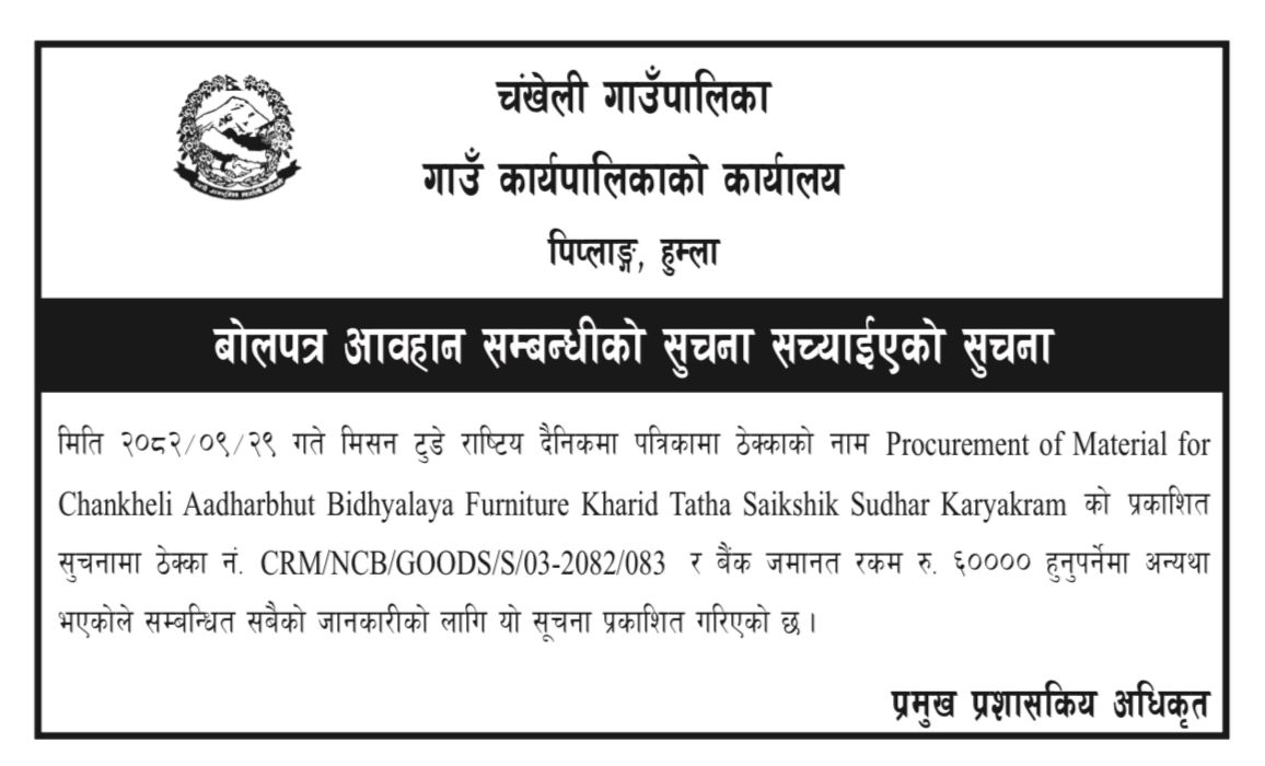 » मिति २०८२।०९।२९ गते मिसनटुडे राष्ट्रिय दैनिकमा प्रकाशित बोलपत्र आवह्यान सम्बन्धि सुचना सच्याइएको सुचना ।
