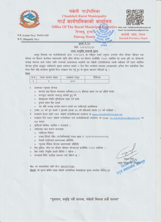 गरिब घरपरिवार पहिचानका लागि २ जना गणक करारमा आवश्यक्ता सम्बन्धी सूचान ।